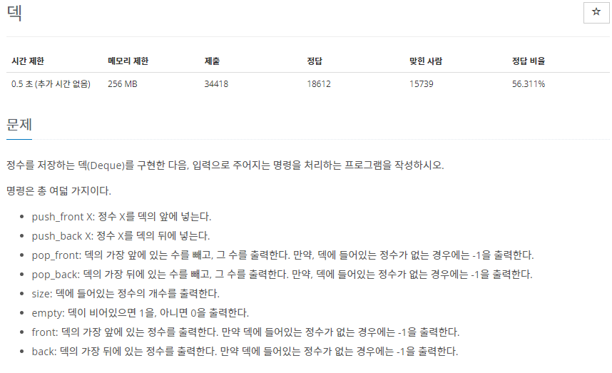 ◾ 스택이나 큐 문제 처럼 덱을 구현해서 명령을 처리하여 결과값을 출력하는 문제