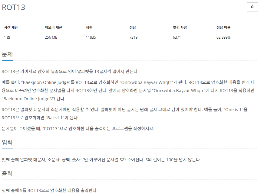 ◾ 주어지는 문자열을 ROT13 에 맞게 암호화 하는 문제.