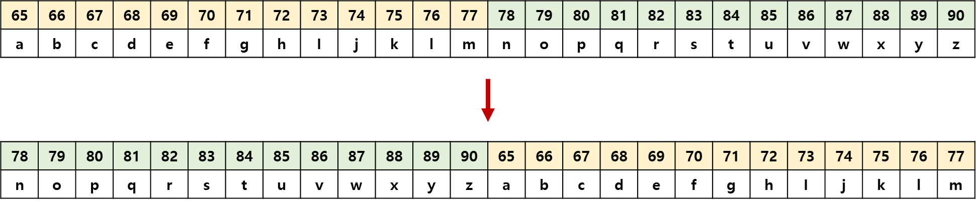 - 영어 알파벳을 13글자씩 밀어서 만든다.