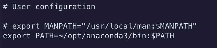 그리고 그 밑에 아나콘다가 설치되어 있는 경로를 적어줍니다. 저는 ~/opt/anaconda3/bin 경로 밑에 있어요.