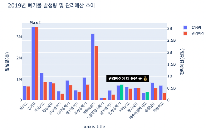 title_text="2019년 폐기물 발생량 및 관리예산 추이",