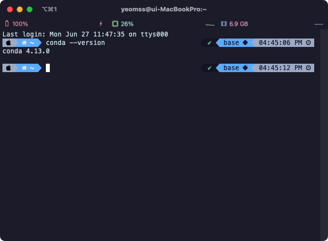 conda 명령어가 전역적으로 실행이 되는지 터미널을 열어 버전을 확인해봅시다.