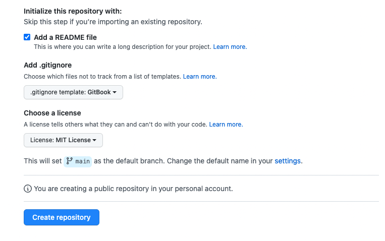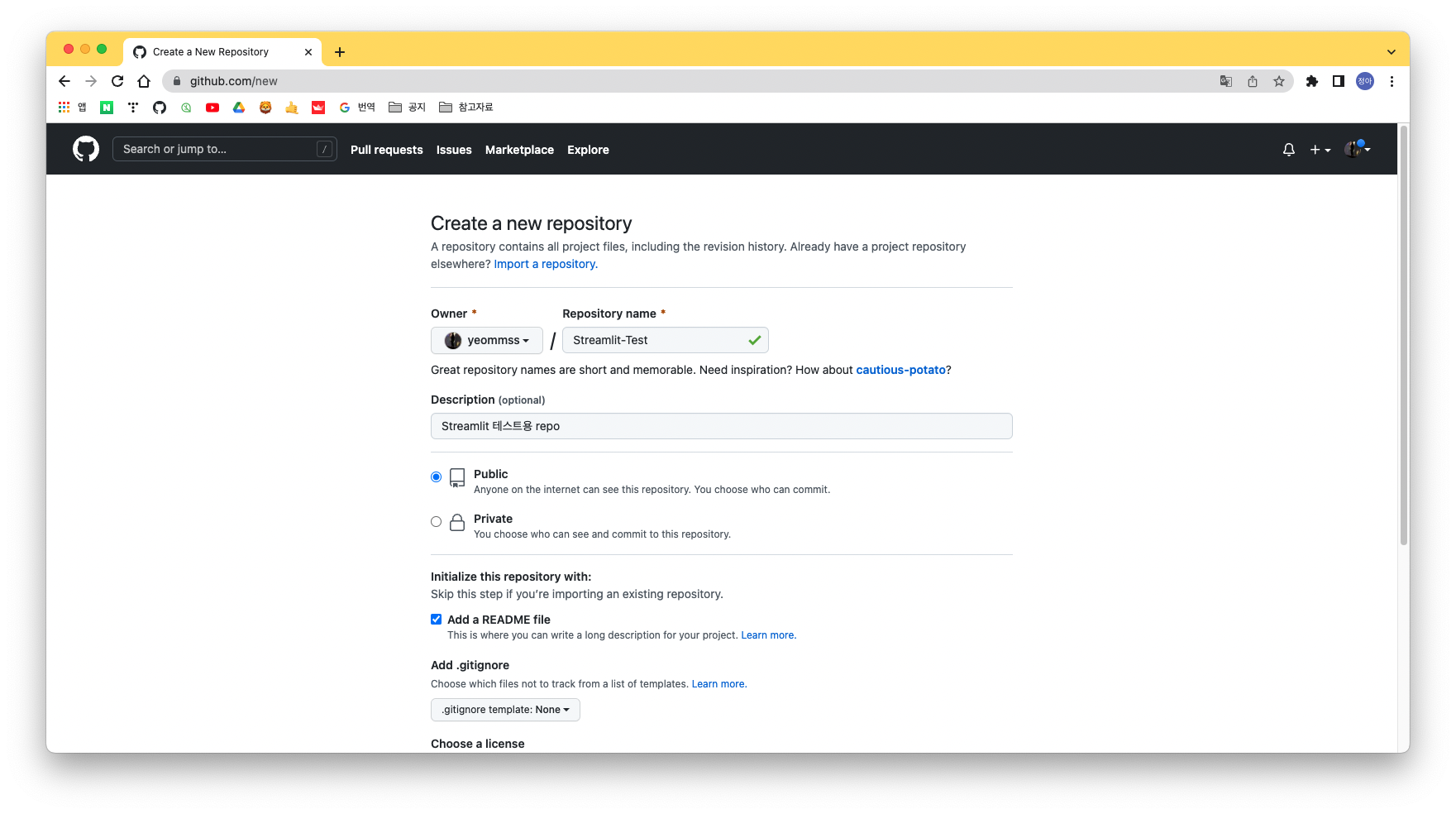 그리고 readMe, gitignore, license 가 필요하시다면 설정을 해서 추가를 해줍니다.