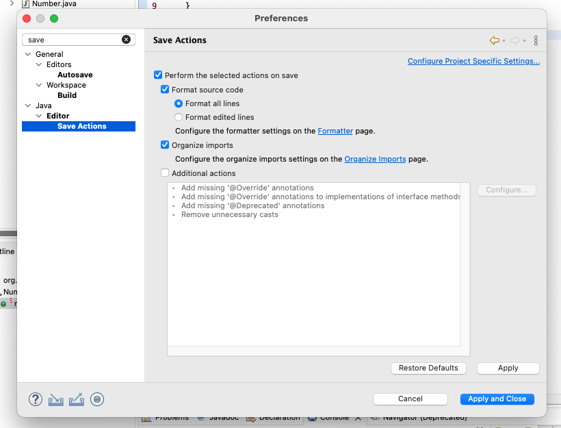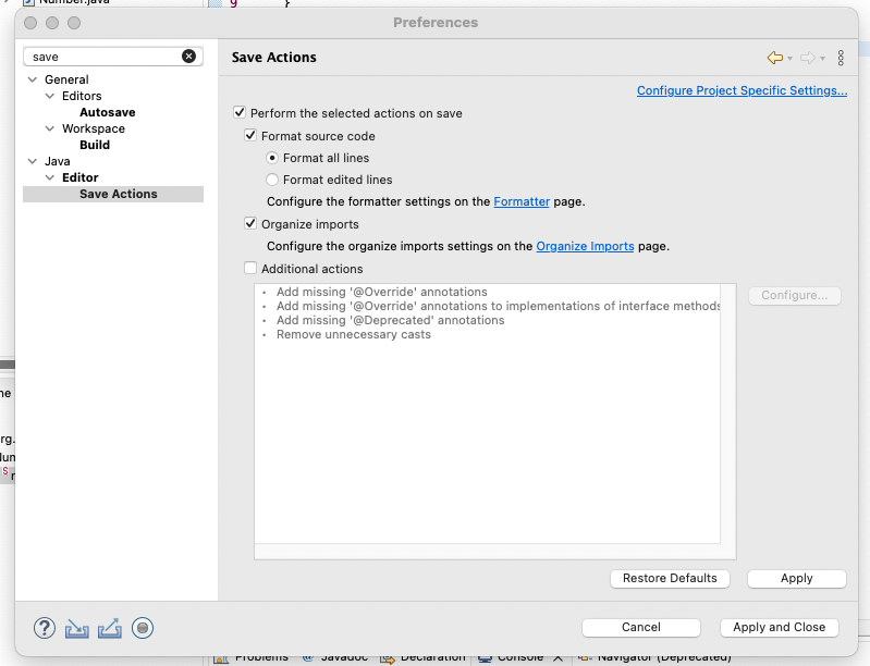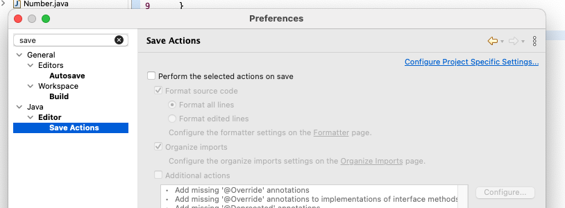 그리고나서 [Java] - [Editor] 밑에 있는 Save Actions 에 들어갑니다.