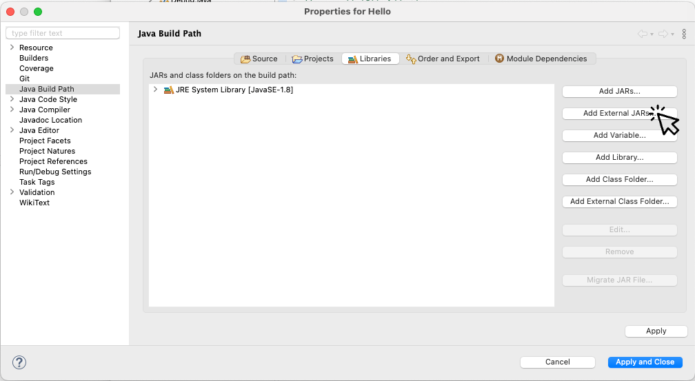 그 다음 [Apply and Close] 를 누르면 다운 받은 Jar 파일이 라이브러리에 등록이 됩니다.