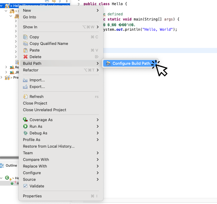 그리고 오른쪽 마우스를 클릭하여 - [Build Path] - [Configure Build Path] 를 클릭합니다.
