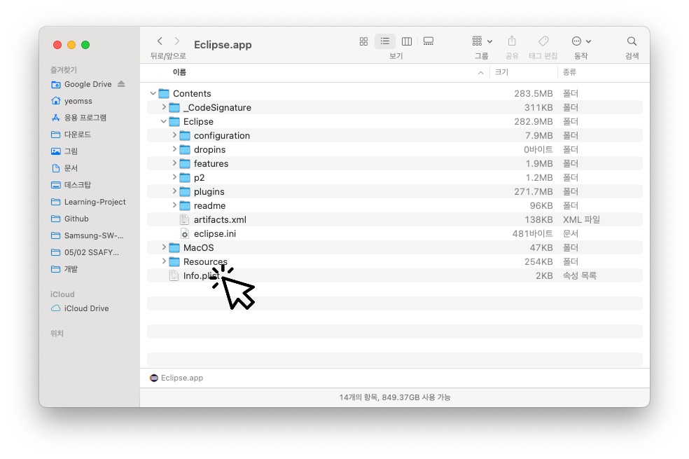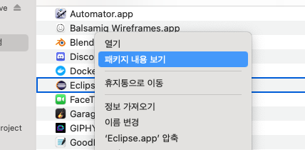 우선 응용 프로그램 내에 있는 Eclipse.app 안 Contents 폴더로 이동해야합니다.