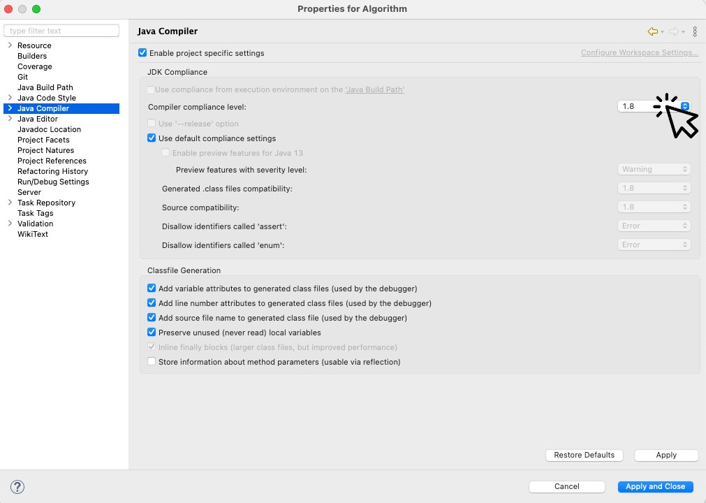 그리고 Java Compiler 로 들어가셔서 저기 자바 버전에 해당하는 것도 다 올바르게 맞춰주세요.