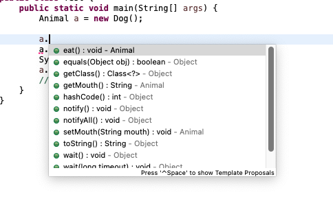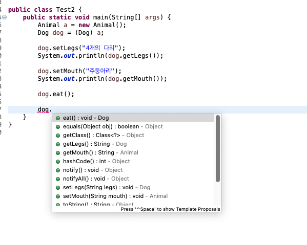 그리고 Dog 객체에 legs 변수와 똑같이 오버라이딩 하여 eat() 메서드를 만들었습니다.