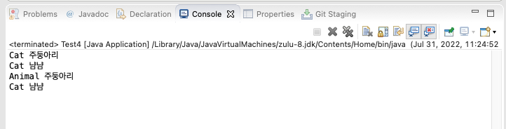 보면 멤버변수는 각자 자기자신을 가져오고, 메서드는 오버라이딩이 돼서 Cat 것을 사용합니다.