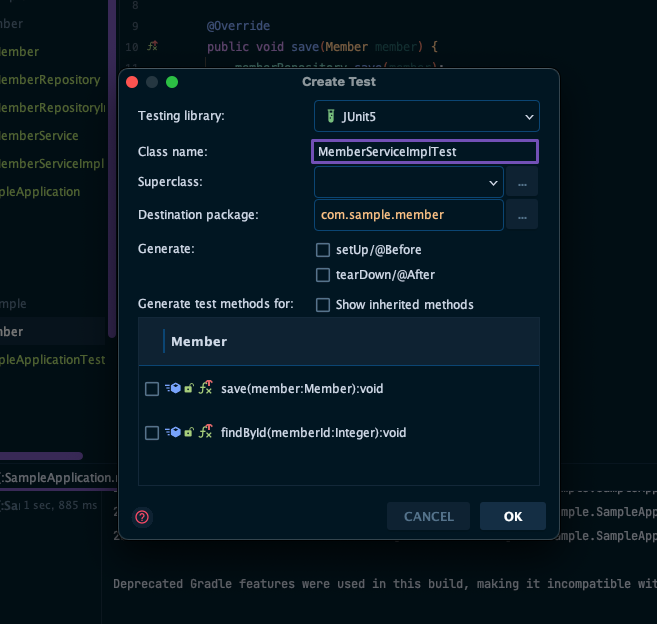 Mac OS 기준 만들고 싶은 클래스 이름에서 Comand + Shift + T 를 누르면 위와 같이 Create New Test 창이 뜹니다.